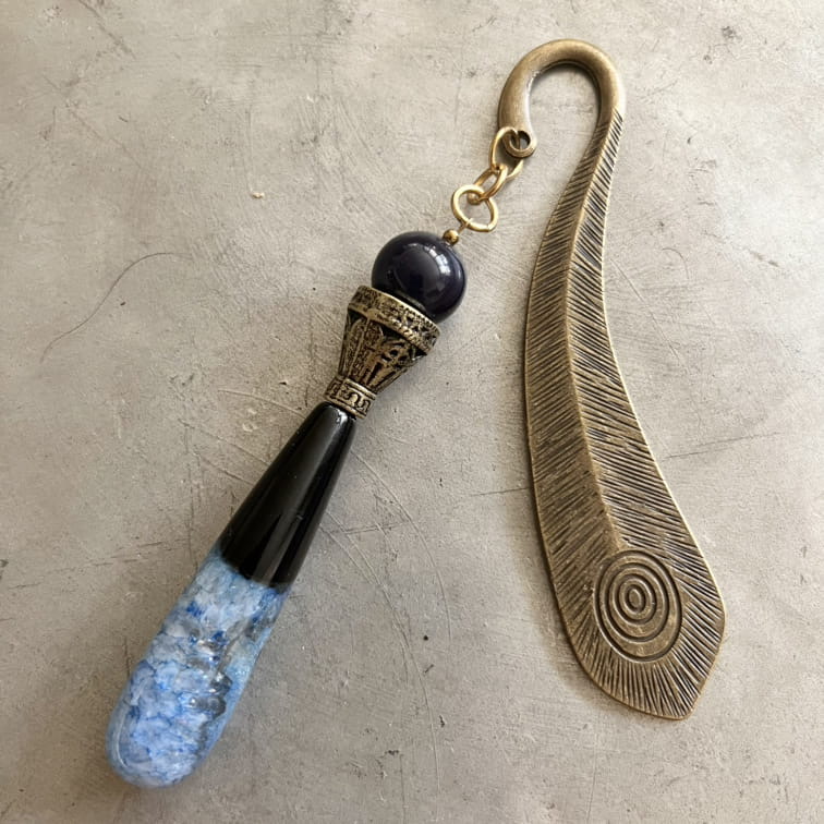 آویز از سنگ عقیق با رنگی جذاب و تراش اشکی که به پایه نشان کتاب متصل شده اند.