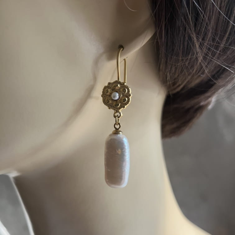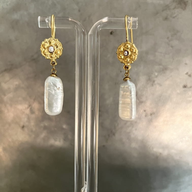 یک جفت مروارید باروک مستطیلی که به پایه های برنجی با روکش طلا که در وسط آن دانه های سنگ ریز قرار گرفته متصل شده اند.