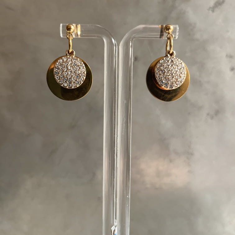 گوشواره ای ساده وسبک از دو دیسک فلزی که دیسک طلایی وبزرگتر استیل هست ودیسک کوچکتر فلز چکشی که به پایه توپی استیل هم متصل شده اند.