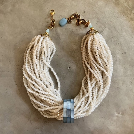 سنگ های عقیق با رنگ کرم و با اشمال مختلف با سنگ های سیاه انیکس ترکیب شده اند. در لا به لای سنگ ها از مهره های حدید استفاده شده است.
