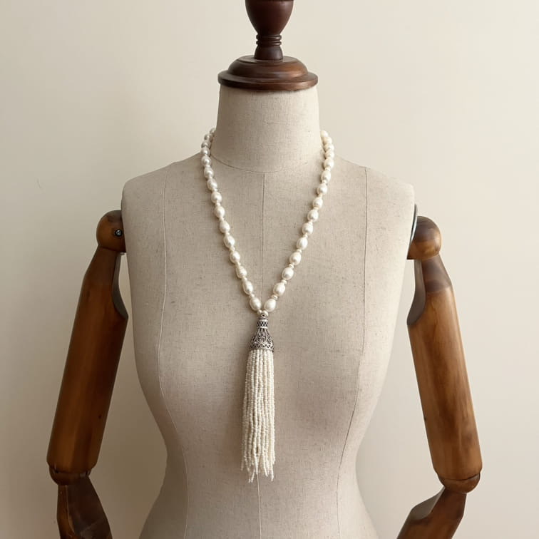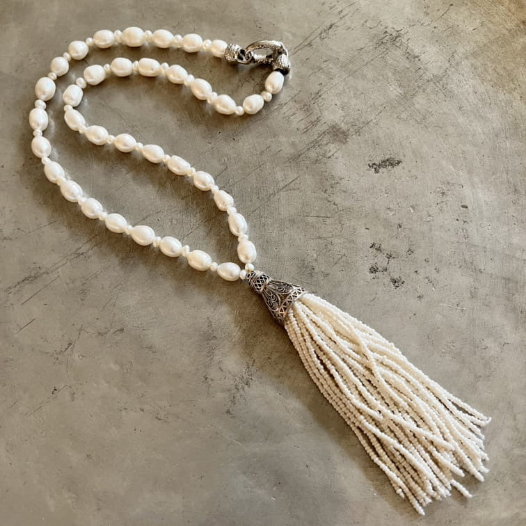 گردنبندی زیبا و اصیل از مروارید پرورشی در دو سایز درشت و ریز که که به کلاهک درشت توری بافت از جنس نقره متصل شده است.