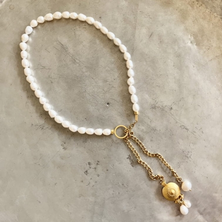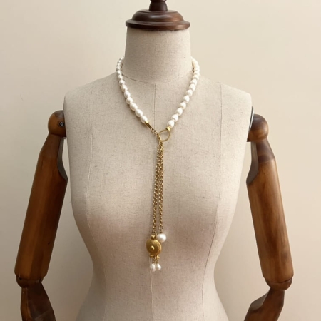 دو رشته از سنگ های طبیعی تراشه از عقیق ، جید ، آمیتیس، دل ربا و حدید که از دو طرف به بست های فلزی و زنجیر و قفل استیل متصل شده اند.