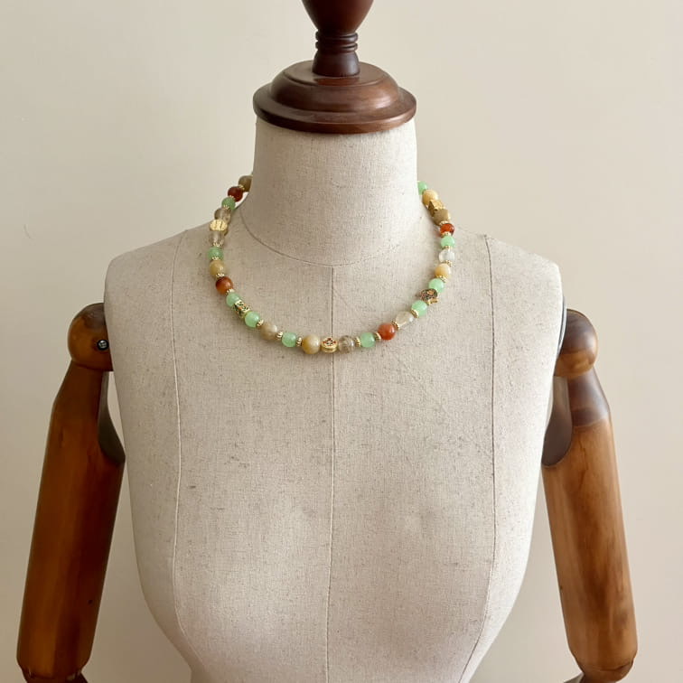 رنگ های ملایم سنگ ها هارمونی خاصی دارند و مهره های فلزی با نقش و نگار جلوه زیبایی به این گردنبند داده است.