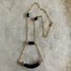گردنبندی خاص و جذاب با رنگ آرامش بخش آبی از سنگ های آکوامارین و عقیق که با المان های فلزی و سنگ حدید ترکیب شده اند. در دو انتهای این گردنیند از مهره های شیشه ای نقاشی شده و کلاهک های برنجی با روکش طلایی استفاده شده است.