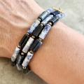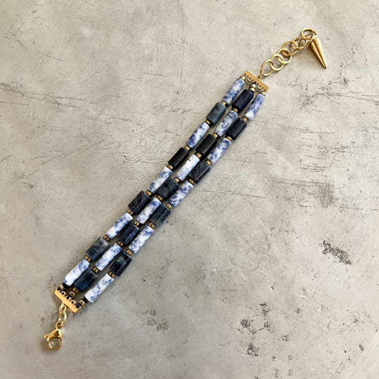 سه رشته سنگ لوله ای از سنگسودالیت و عقیق سورمه ای که از طرفین به بست های استیل متصل شده اند.
