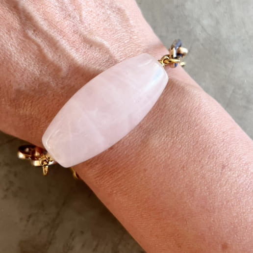 تک سنگ درشت با تراش استوانه ای از عقیق صورتی که از دو طرف به حلقه های استیل با روکش مینایی رنگی متصل شده اند.