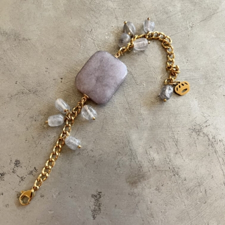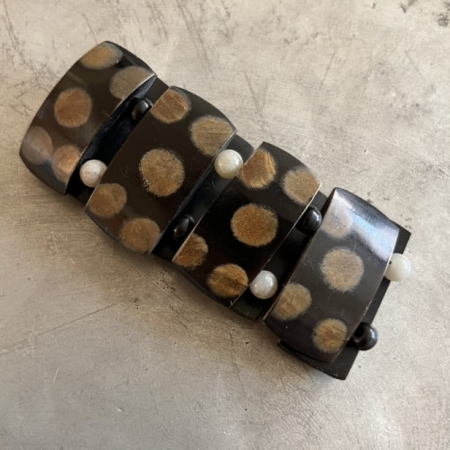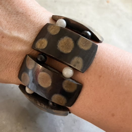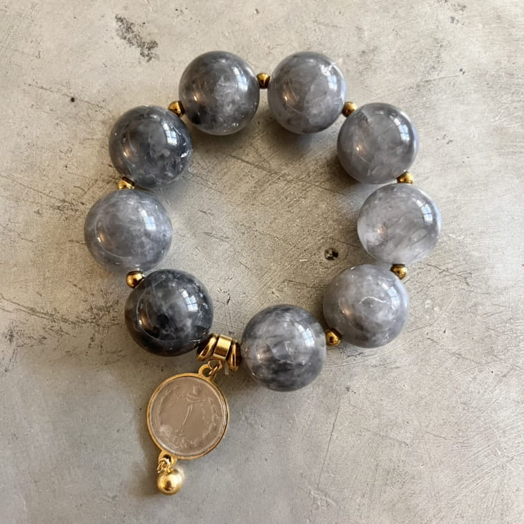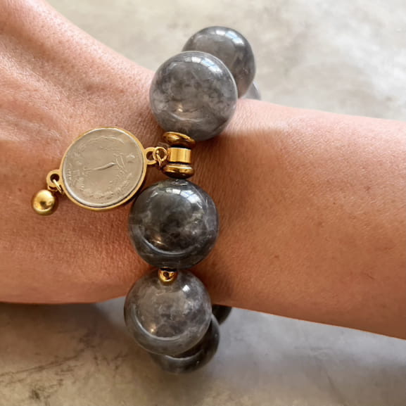 دستبند کشی از سنگ های درشت و زیبای لارویکیت که با گوی های ریز حدید از هم جدا شده اند.